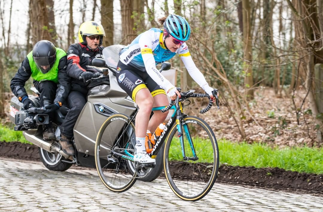Belgio.Quest’anno il “Nokere Koerse” è stato aperto anche all’edizione femminile. Abbiamo così inaugurato i 120km di percorso con 21 settori di pavé. L’arrivo era posto al culmine di una salita di 400m in pavé ed all’8% di pendenza. Fin da subito la velocità si è mantenuta molto elevata ed anche i tentativi di fuga sono cominciati presto. Percorso un primo tratto in linea siamo entrate nel circuito finale. Al secondo giro dei 7 previsti , in un tratto in cui la strada saliva, si è formato un gruppetto di 6 unità tra cui io, due atlete del team Sunweb, due del Boels e un’altra ragazza di cui non ricordo la squadra. Due giri dopo, quando mancavano più o meno 30km, nello stesso punto, ci ho riprovato nella speranza che qualcun’altra concorrente mi seguisse ma così non è stato e mi sono trovata in testa alla corsa. Sapevo che da sola sarebbe stato difficile, ma ci ho provato comunque perché sono convinta che qualche volta valga la pena rischiare per centrare il risultato pieno. Il mio vantaggio sul gruppo ha raggiunto i 47″. All’ultimo giro però sono stata ripresa vedendomi poi costretta a rinunciare allo sprint finale e finendo la gara nella “pancia”del gruppo.